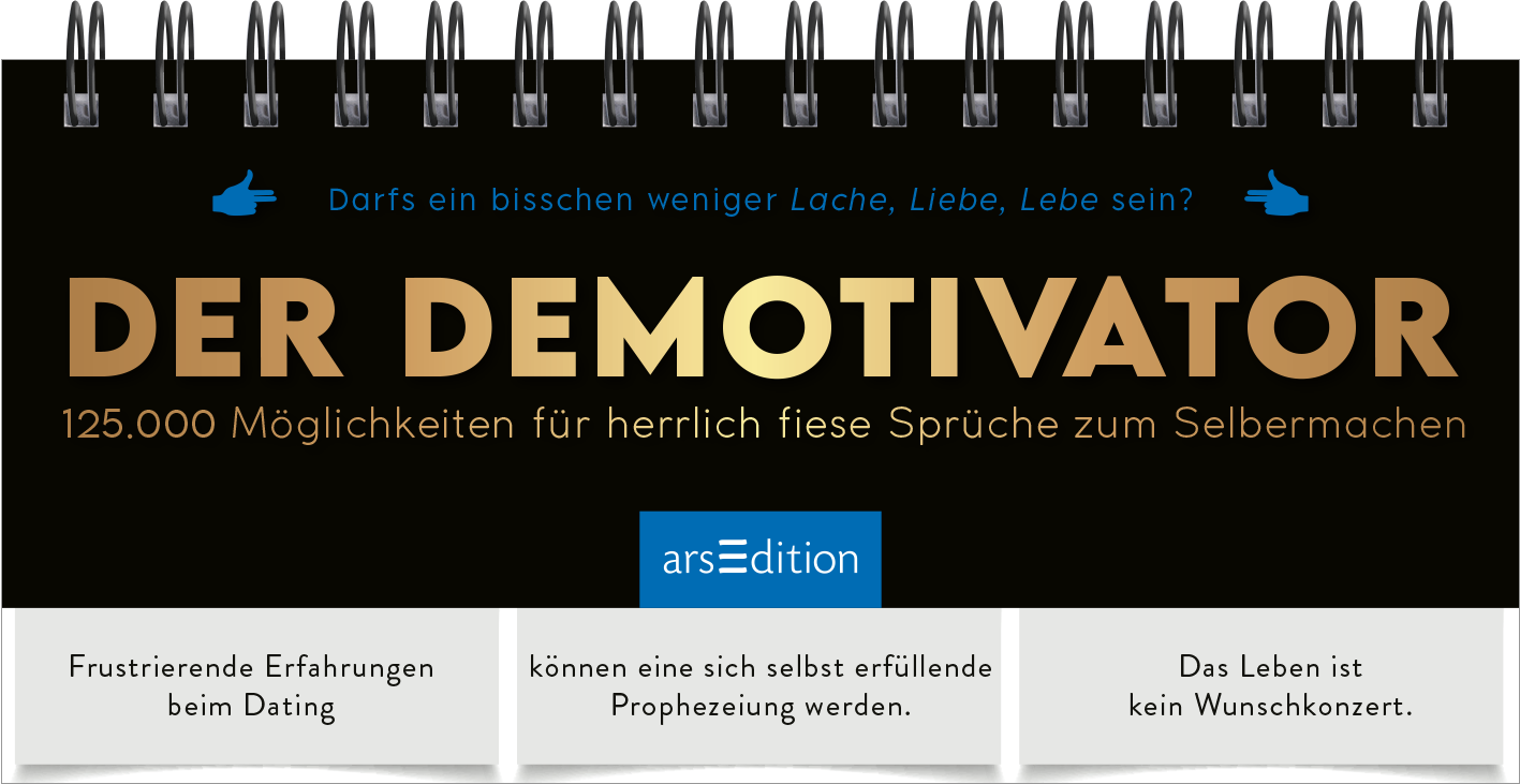 Manchmal braucht man einfach einen frechen Spruch oder einen sarkastischen Kommentar, um den Alltag etwas aufzuheitern. Genau dafür gibt es den „Demotivator“, einen Tischaufsteller mit 3 Teilen zum Umklappen, aus denen du immer wieder neue böse Sprüche zusammenstellen kannst. Mit ihrem bissigen und humorvollen Ton sorgen sie für jede Menge Gesprächsstoff und Gelächter. Ein witziger Hingucker für jeden Schreibtisch und jedes Regal und ein lustiges Geschenk für Freund:innen mit viel Sinn für Humor. Nach dem Motto: „Deine positivsten Affirmationen - können verstörende Auswirkungen auf deinen Beziehungsstatus haben - Blöd gelaufen!“