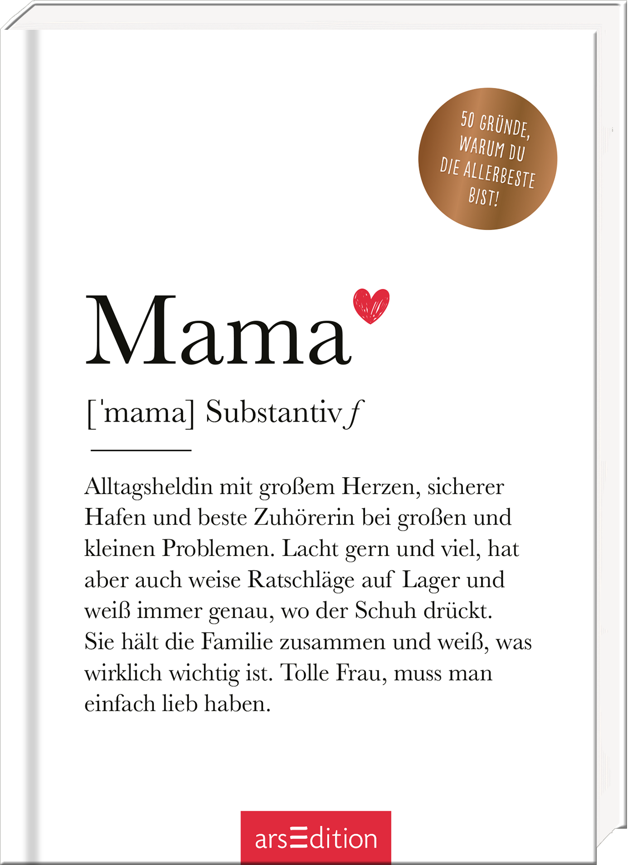 ![Das Buchcover zeigt den Titel „Mama“ in großer, eleganter Schrift, farblich in einem kräftigen Schwarz gehalten. Ein rotes Herz über dem Titel vermittelt Liebe und Zuneigung. Der Untertitel „[‘mama] Substantiv f“ steht in einer kleineren Schriftgröße darunter. Darunter befindet sich der Text: „Alltagsheldin mit großem Herzen, sicherer Hafen…“. Oben rechts prangt ein goldenes Bestseller-Button mit dem Aufdruck „50 Gründe, warum du die allerbeste bist!“. Ganz unten...](http://arsedition.de/cdn/shop/files/ANS_9783845853017_3D.png?v=1759133053&width=1445)