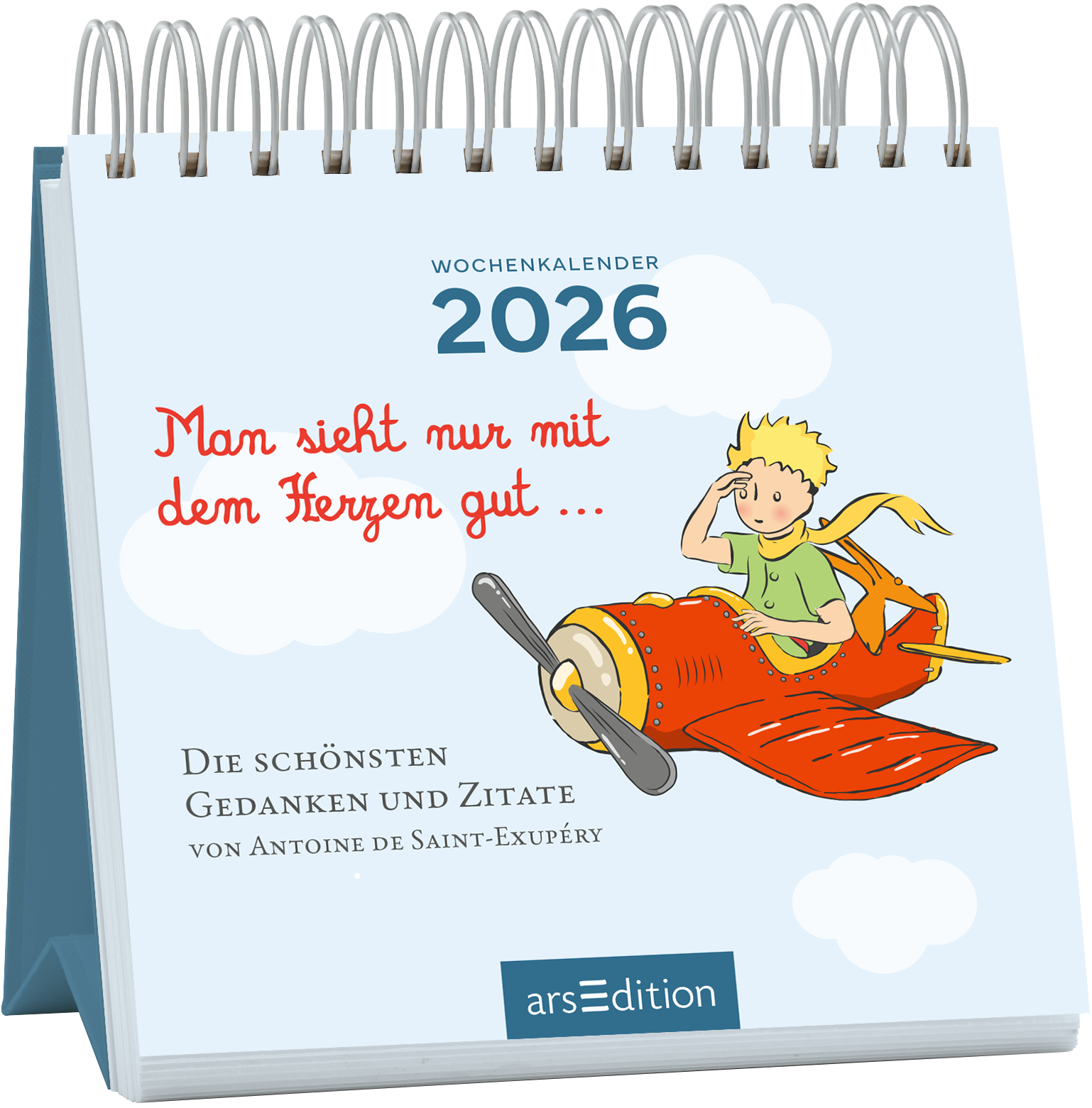 „Man sieht nur mit dem Herzen gut“ ist das wohl bekannteste Zitat von Antoine de Saint-Exupéry. In diesem aufstellbaren Minikalender mit Wochenkalendarium für 2026 finden sich die schönsten Zitate aus „Der Kleine Prinz“ sowie tiefsinnige Zitate aus anderen Werken des berühmten Autors. Kombiniert mit seinen liebevollen Zeichnungen ist der kleine Tischaufsteller ein echter Blickfang auf dem Schreibtisch, Nachttisch oder im Regal. Mit dem praktischen Wochenkalendarium behält man stets den Überblick, egal ob im Büro, Homeoffice oder zu Hause. Durch seine geschmackvolle Gestaltung ist der Minikalender auch eine wunderschöne Schreibtischdeko.