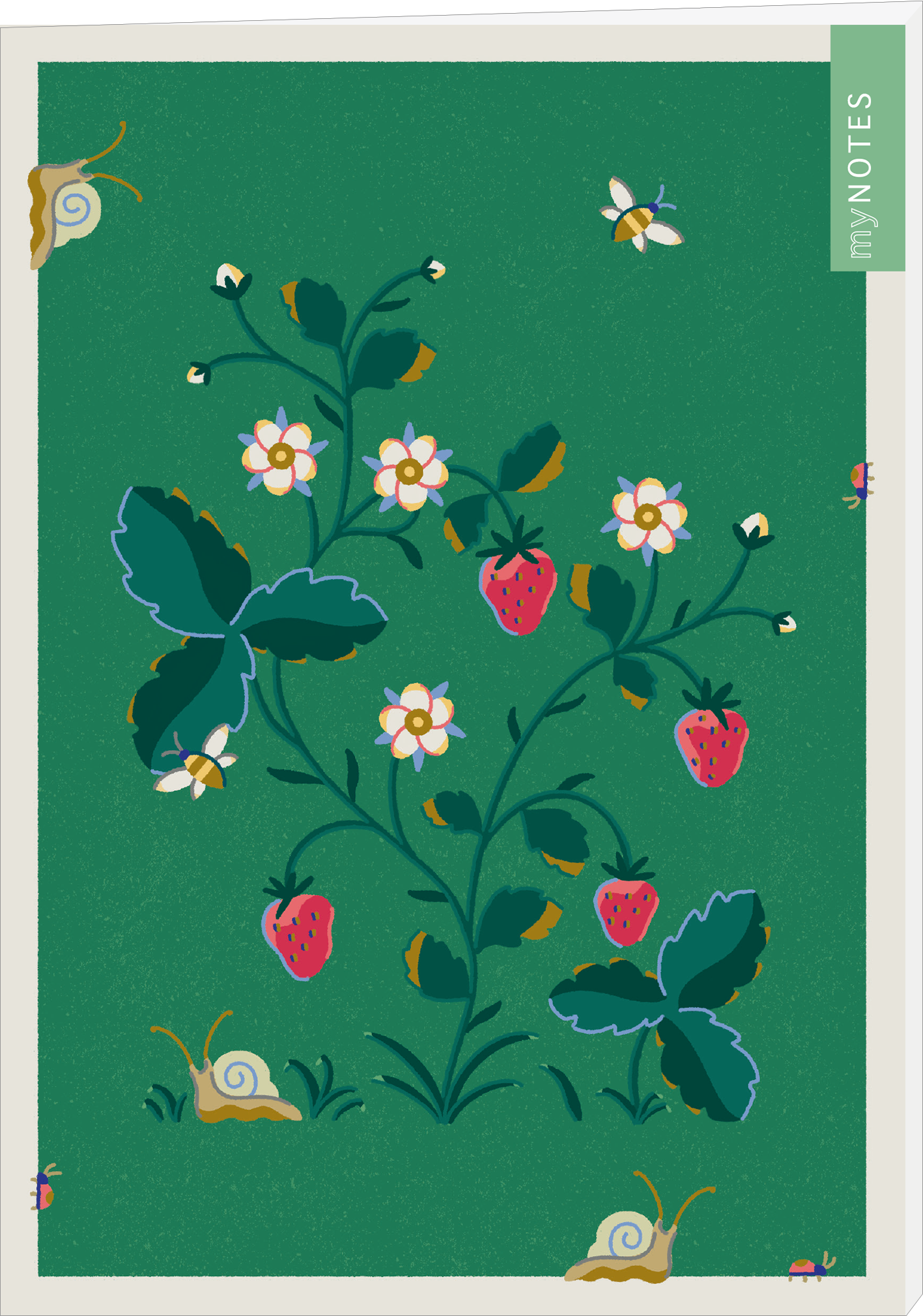 - Liebevolle Gestaltung: Auf petrolgrünem Hintergrund zieren, von der Frühlingssonne gewärmt, reife Erdbeeren und zarte Blüten das Cover des Notizheftes
