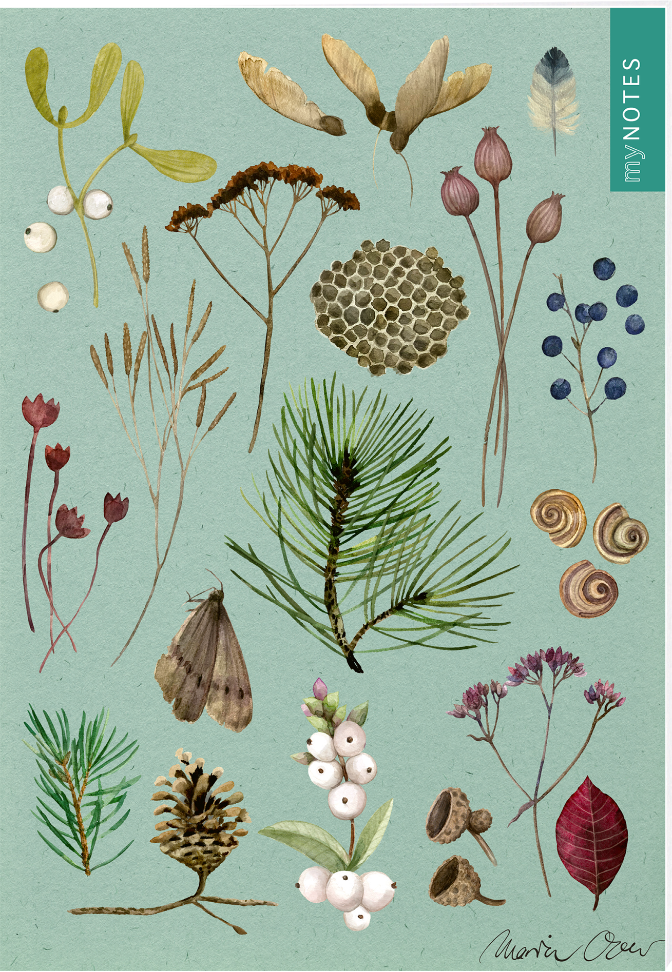 - Handgemalte Fundstücke aus dem Winterwald: Schneebeeren, Kiefernzapfen, Ahornsamen und Tannenzweige zieren dieses Notizheft und bringen dir ein bisschen Winterzauber in dein Zuhause. Die Papeterie-Linie „Naturschätze“ von Maria Over feiert all das Schöne, das du im Winter draußen entdecken und sammeln kannst