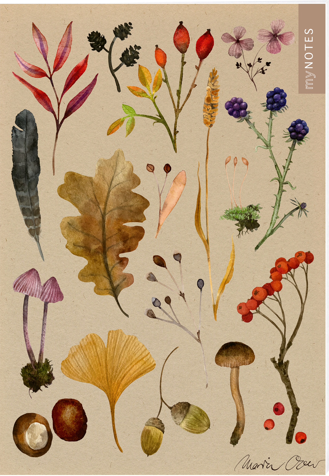 - Handgemalte Fundstücke vom Herbstspaziergang: Bunte Blätter, Kastanien, Pilze und Hagebutten zieren dieses Notizbuch und bringen dir ein bisschen Herbstmagie in dein Zuhause. Die Papeterie-Linie „Naturschätze“ von Maria Over feiert all das Schöne, das du im Herbst draußen entdecken und sammeln kannst
