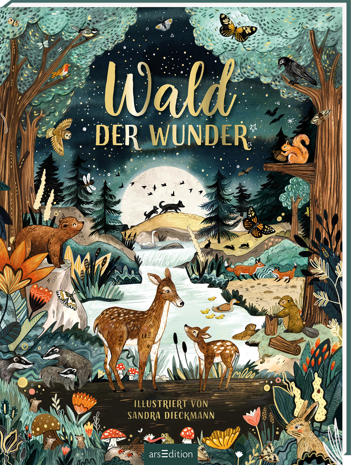 Die Morgensonne kitzelt das junge Hirschkalb und seine Mutter wach. Sie werden heute das saftigste Gras des Waldes suchen. Im Laufe der Seiten entdeckst du auf deinem Wald-Spaziergang auch die Füchse und Schmetterlinge, Bären und Bienen, Eichhörnchen und Vögel, Wölfe, Dachse und viele mehr ... Doch langsam geht die Sonne unter, der Mond zeigt sich über den Bäumen. Auch wenn viele Tiere noch draußen sind, ist es für uns Zeit, Gute Nacht zu sagen!